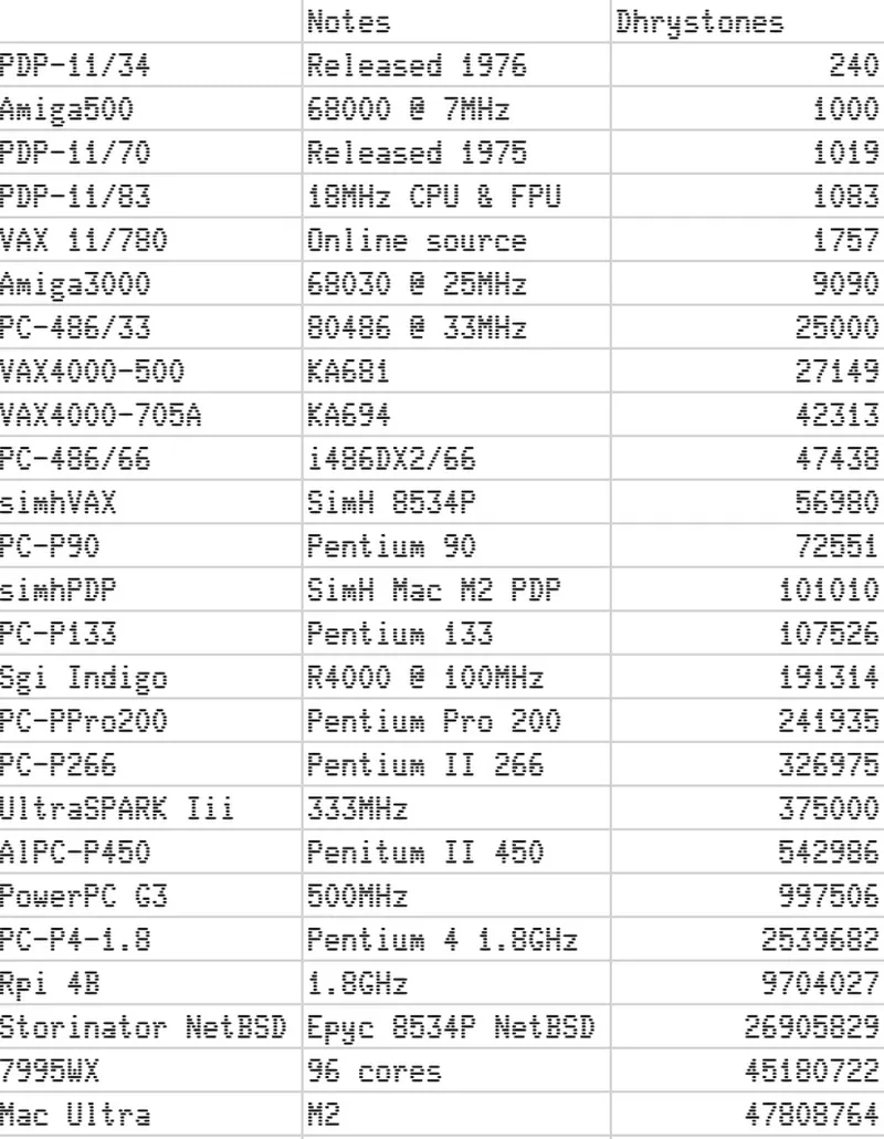 Бывший инженер Microsoft Дэйв Пламмер провел сравнительный тест производительности 25 компьютеров, выпущенных с 1976 по 2023 год. Согласно результатам, современный Mac Pro на процессоре Apple M2 Ultra оказался в 200 000 раз быстрее миникомпьютера PDP-11/34 1970-х годов. Для сравнения использовался бенчмарк Dhrystone 2.2, совместимый со всеми тестируемыми системами.