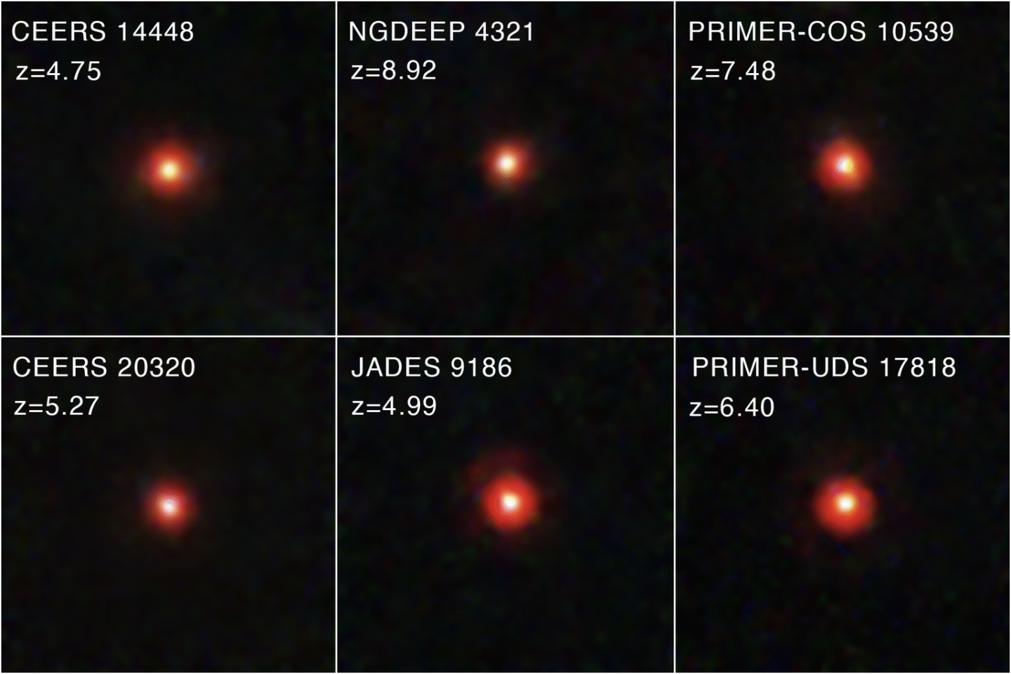 Изображение «маленьких красных точек», обнаруженных в ранней Вселенной, полученное телескопом JWST.