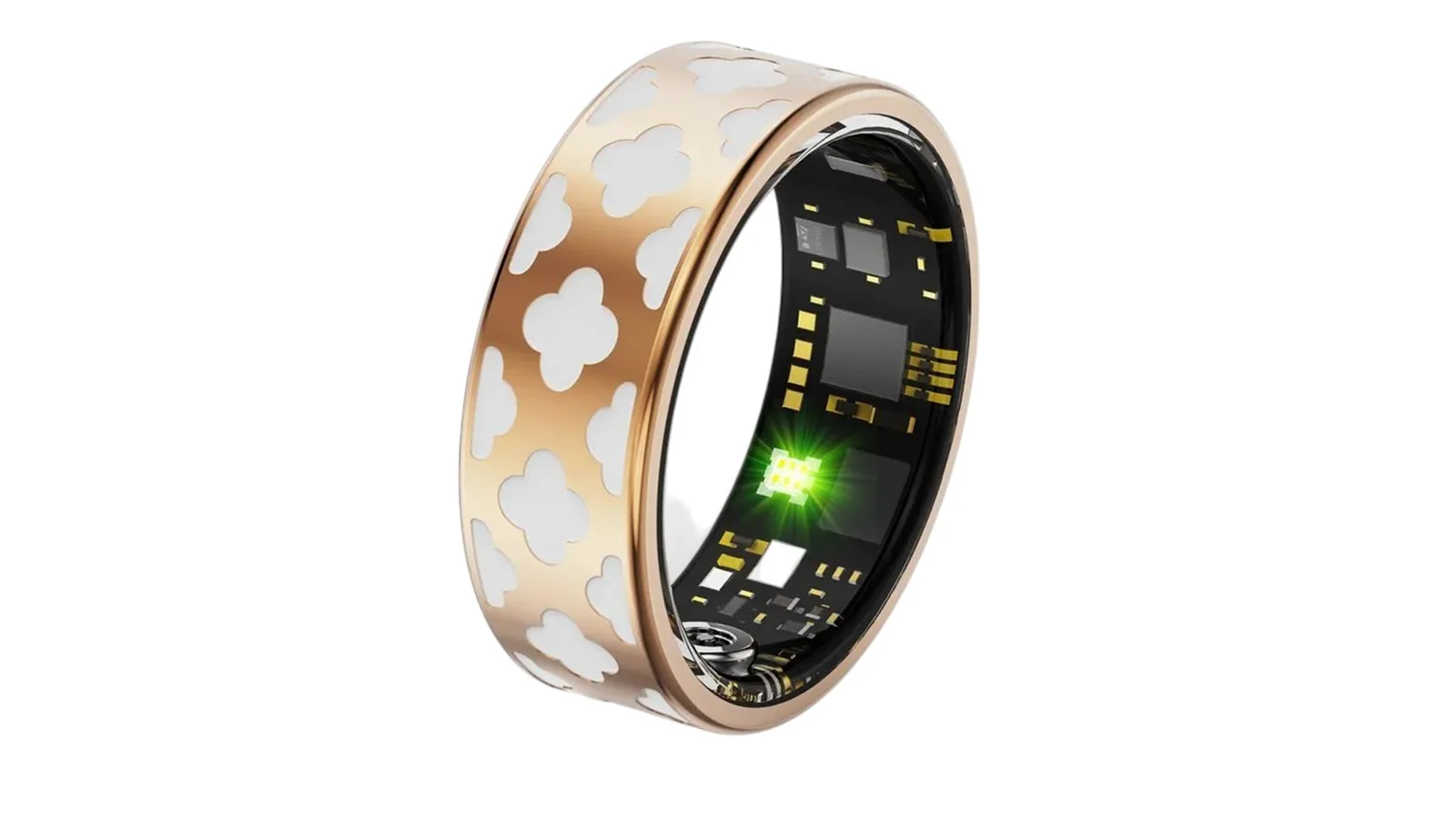 Кольцо выполнено в цвете розового золота, имеет защиту IP68 и работает до 5 дней на одном заряде. Зарядка происходит через специальный кейс и занимает около двух часов.